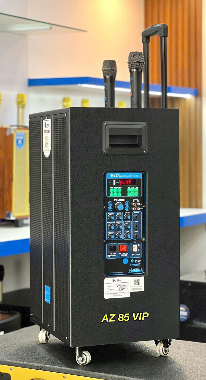 – Loa kéo di động AZPro AZ-85 VIP BASS 4 tấc là mẫu dùng bass 15” + Bas trung + treble , công suất đỉnh 550W, loa có giá rất mềm nhưng âm thanh nghe rất tốt, loa có kèm theo 02 microphone không dây UHF và bạn có thể ca hát vui vẻ trong lúc rảnh rỗi hoặc hát chung với gia đình và bạn bè.