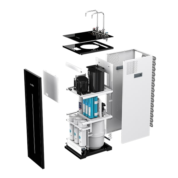 Phong cách thiết kế vô cùng thời thượng với tủ kính tràn viền sang trọng, hiện đại kết hợp cùng màu đen ấn tượng để người dùng có thể dễ dàng đặt bất cứ nơi nào trong nhà và nâng tầm không gian sống. Bên cạnh đó, kết cấu bên trong được thiết kế khoa học theo từng cụm linh kiện, tạo điều kiện thuận lợi cho việc thay thế lõi lọc.